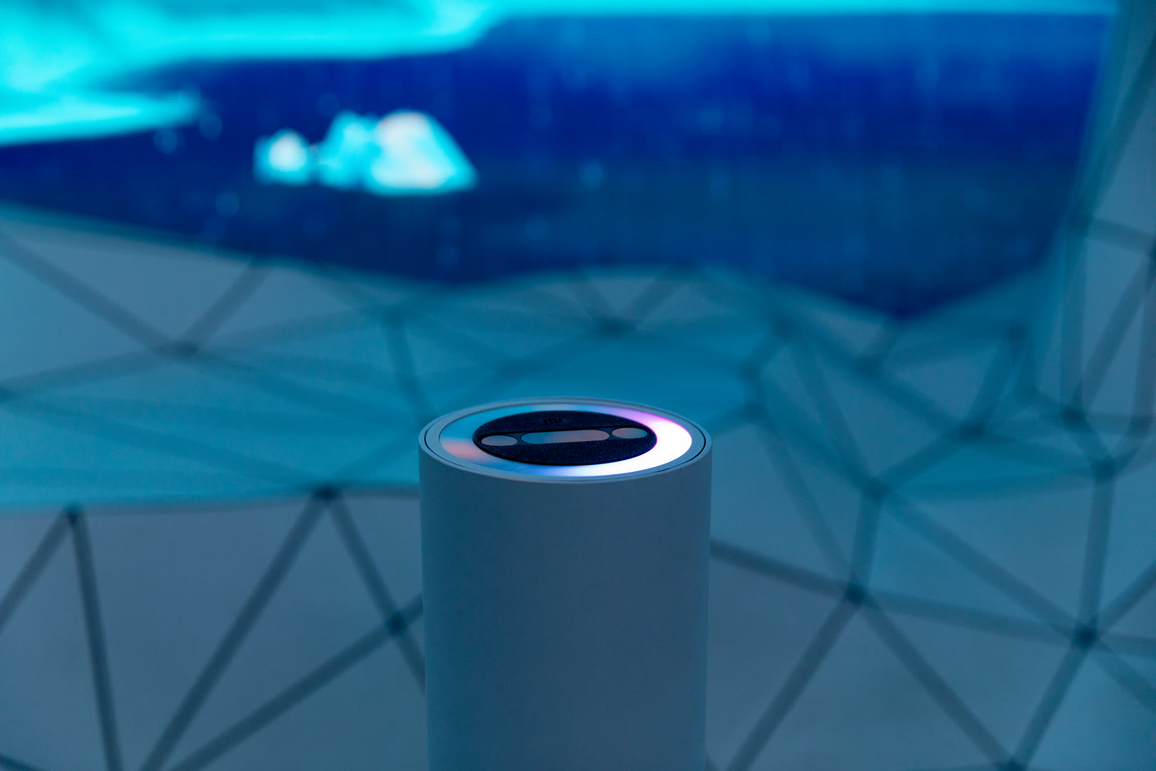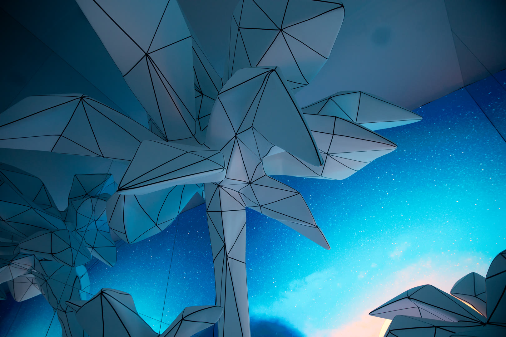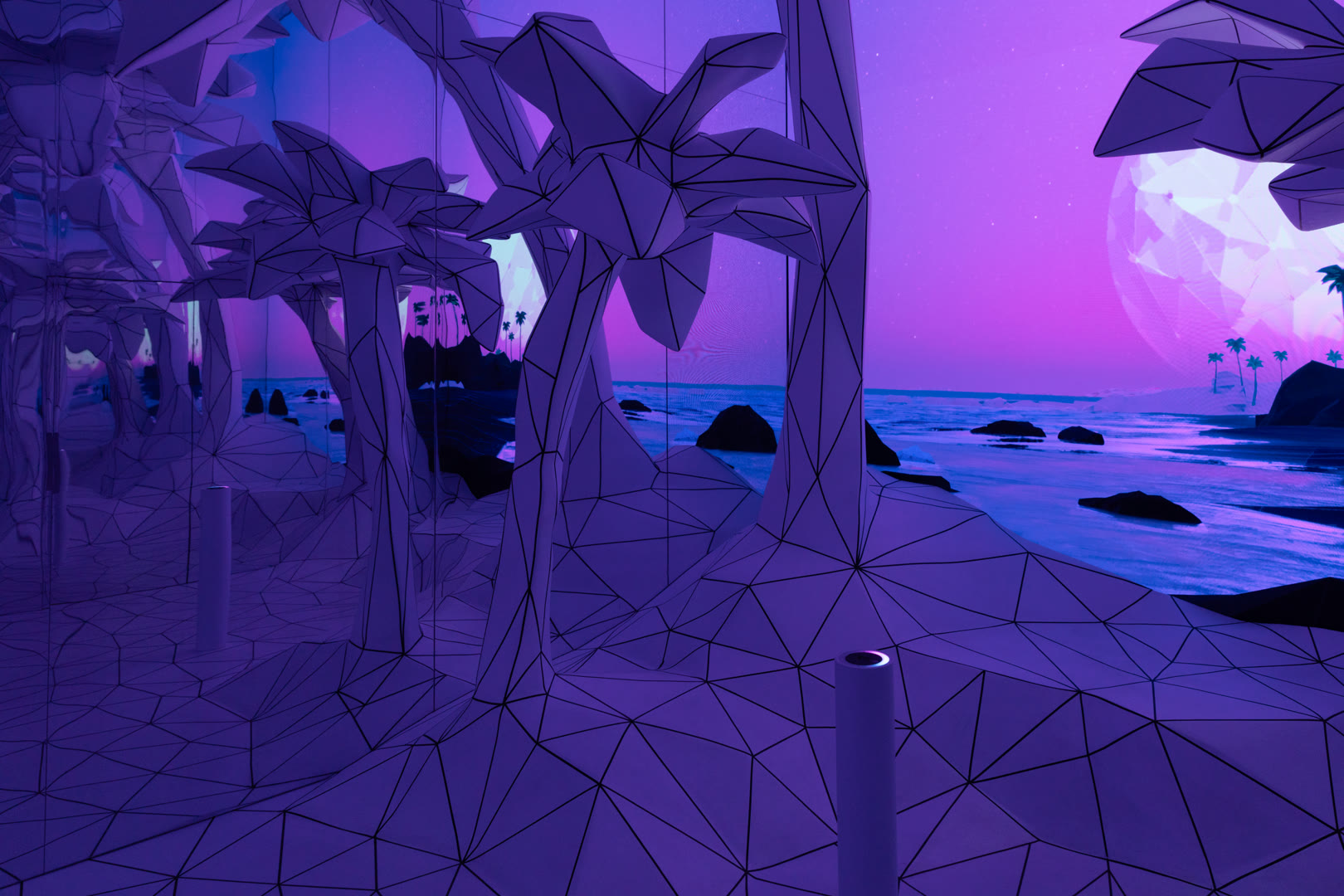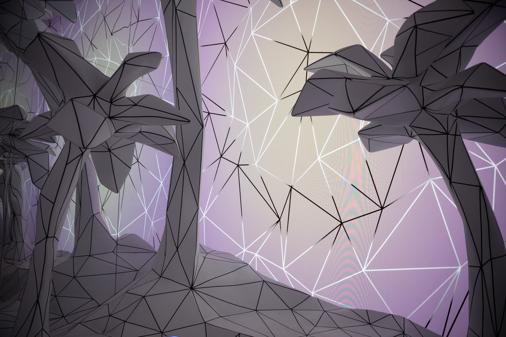 Inside a mirrored enclosure, guests stepped onto a faceted low-poly floor accented with bold black lines. A large-format LED wall extended Unreal Engine environments into infinity, with avant-garde LUTs washing the space in shifting colors. Using a Leap Motion sensor, visitors could control these LUT blends with hand gestures, while live NOAA weather data drove dynamic skies overhead.